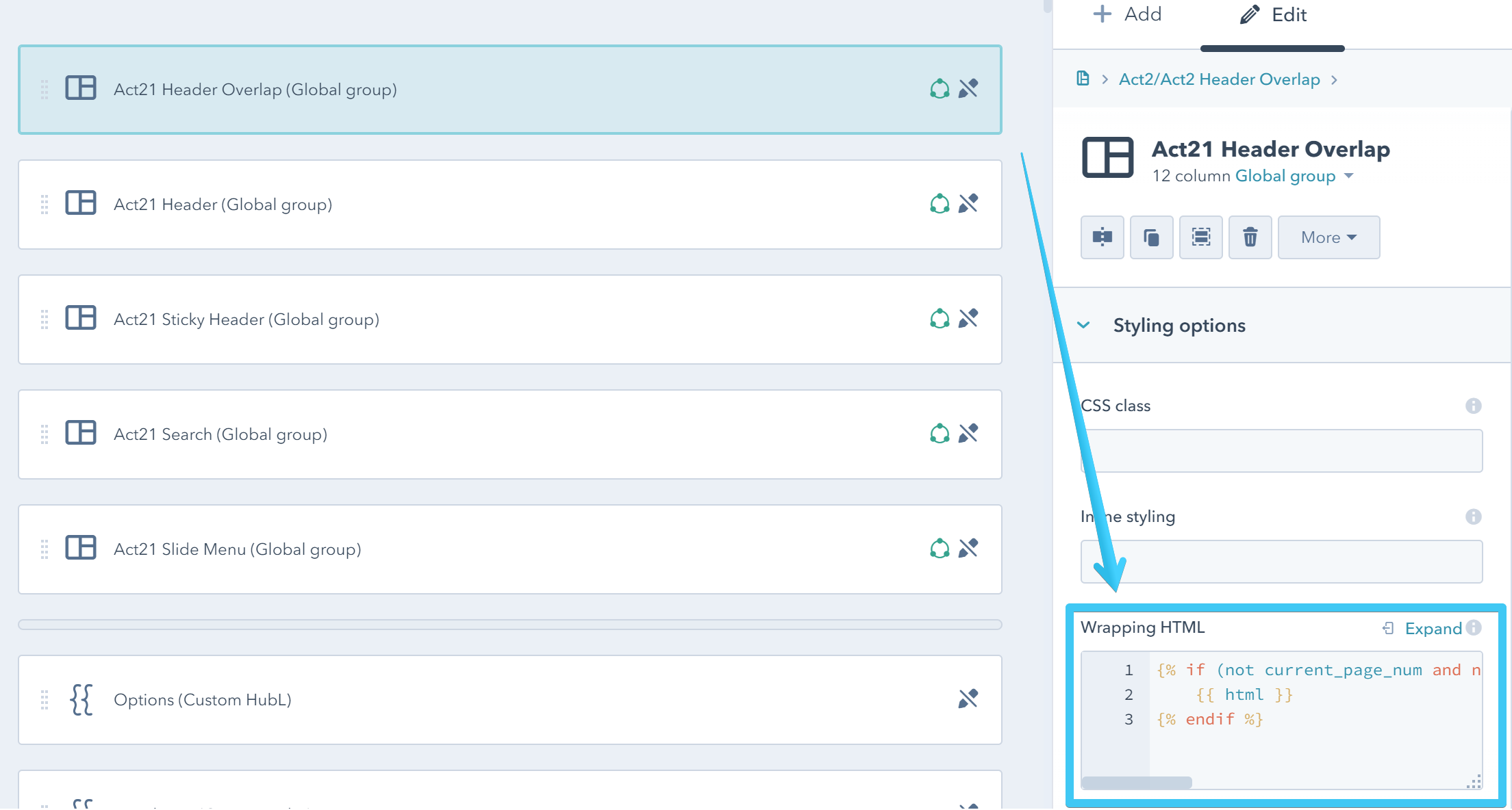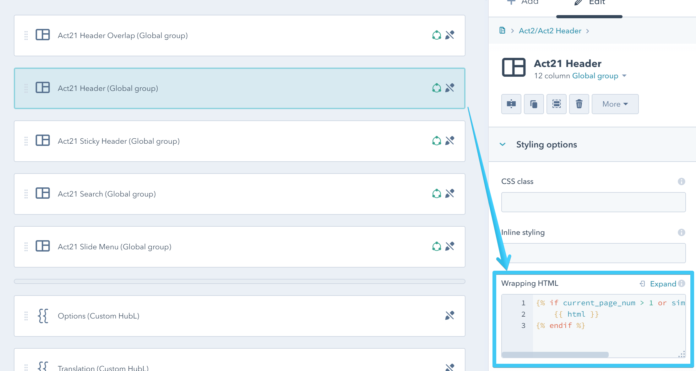 For that reason we had to include both Act21 Header and Act21 Header Overlap global groups with some HubL conditional wrappers to show one or another depending on where on the blog the visitor is. So please make sure that if you swap the modules, you copy and paste the same HubL wrappers to your new modules.