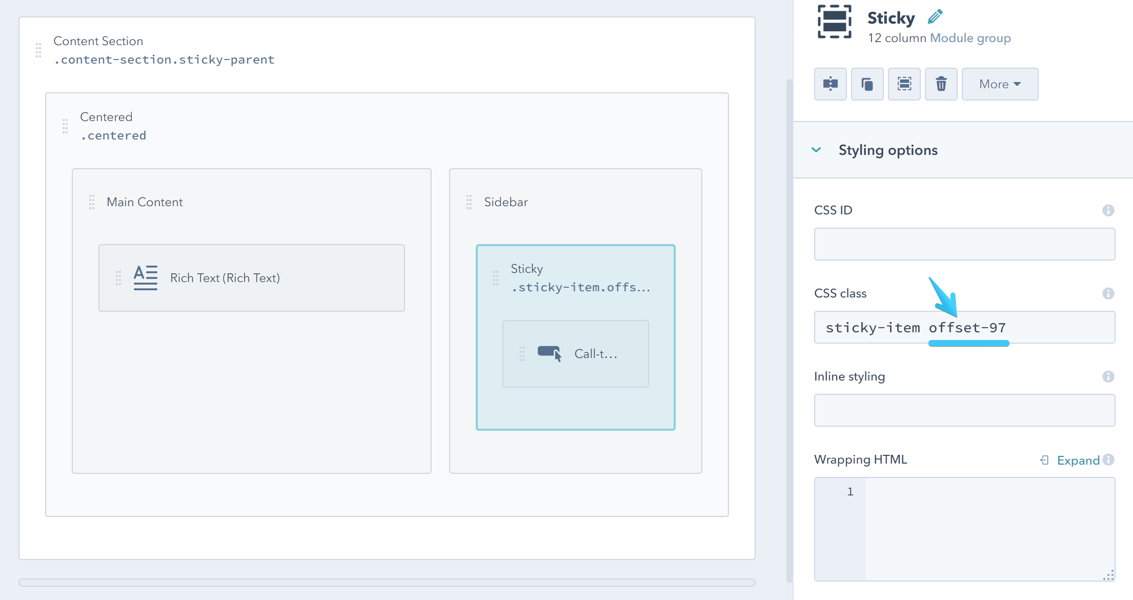 This is the actual element that will stick at the top while scrolling. Add this class to your module or group: sticky-item